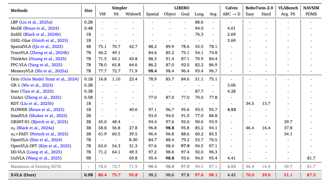 在包括LIBERO、SIMPLER等在内的权威仿真环境中,X-VLA均取得了SOTA性能,显著优于现有同类模型。