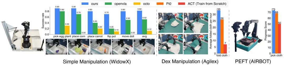 得益于高质量的预训练基座,X-VLA 在后训练(微调)阶段展现出极高的数据效率与稳定性。针对不同的下游任务(如自主叠衣),只需使用中小规模的场景专属数据进行微调,模型便能快速适应并达到SOTA性能。这源于预训练阶段学习到的通用视觉-语言-动作表征,以及后训练中采用的定制化学习率策略与慢启动机制,它们共同确保了知识从通用域到特定任务的高效、稳定迁移。