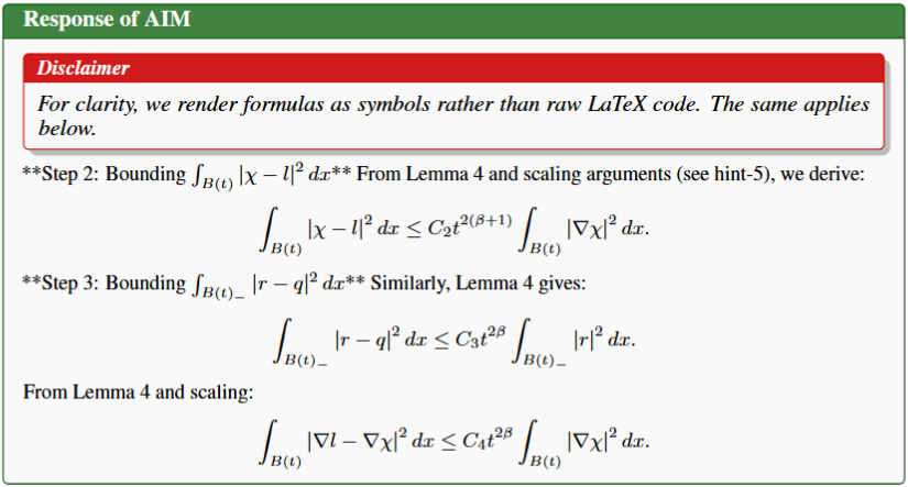 在“Regularity of Cell Problem”这一子问题的证明过程中,人类专家明确引入了来自Schauder Theory的辅助引理,并将这些引理作为提示信息提供给AIM(图3)。通过这种方式,人类专家引导 AIM 在推导后续结论时运用这些引理,从而有效构建并约束其推理过程,使其朝着得出有效且完整的论证方向推进。