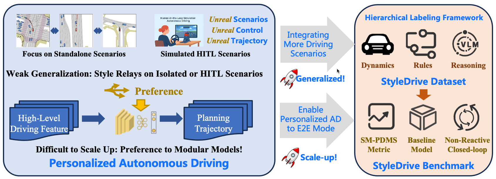 个性化是提升用户体验和建立自动驾驶系统信任感的重要发展方向。在传统的模块化的自动驾驶架构中,已涌现不少支持个体偏好的定制化方法。然而,这些方法大多依赖场景特定的设计或模拟环境中不真实的人工交互,导致在复杂动态的真实交通场景中难以泛化。与之对比,端到端自动驾驶(E2EAD)将感知、规划与控制融合到同一框架,具备更强的优化潜力与泛化潜力。但当前E2EAD研究普遍忽略了个性化建模,使得车辆行为趋于“平均化”,难以体现用户的风格偏好。这不仅限制了系统的适应性,也阻碍了个性化、以人为本的自动驾驶愿景落地。要解决这一问题,首先需要一个大规模、真实世界驾驶倾向标注的数据集,同时配套标准化的评测基准,以系统地推动个性化E2EAD的发展。StyleDrive正是首个为个性化端到端自动驾驶设计的真实世界数据集与评测体系: