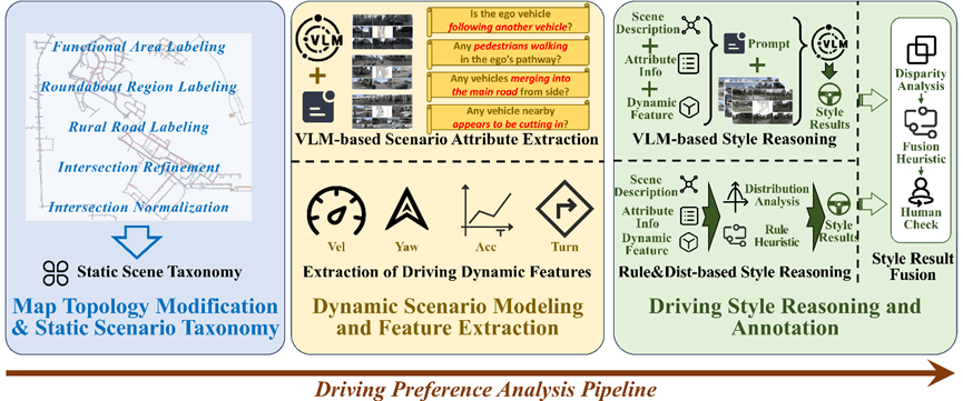为了实现可靠且可解释的倾向分析,构建了一个结合规则与场景理解的融合标注框架(如图2所示)。该流程首先从真实道路拓扑中提取静态环境特征,从车辆运动数据中提取动态环境特征;随后通过微调后的视觉语言模型(VLM)推理动态上下文语义实现更细粒度的场景构建;在静动态场景构建基础上,通过驾驶行为分布分析与规则启发方法生成客观倾向标注;同时,为应对驾驶倾向中的主观性问题,进一步利用 VLM 联合建模场景语义与驾驶行为,生成主观倾向判断。最终,融合上述两类标注并进行人工校核,确保数据集中倾向标签的准确性与一致性。