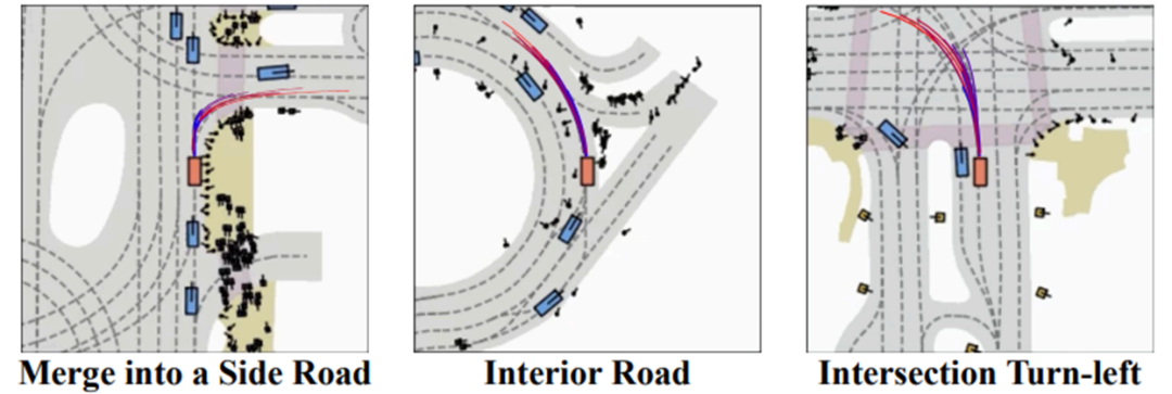 为了凸显倾向控制模型的效果,在相同的场景下给定不同的驾驶倾向,让模型输出预测的轨迹并可视化(如图5),可以看到不同倾向下的轨迹按照驾驶倾向呈现出显著的差异。