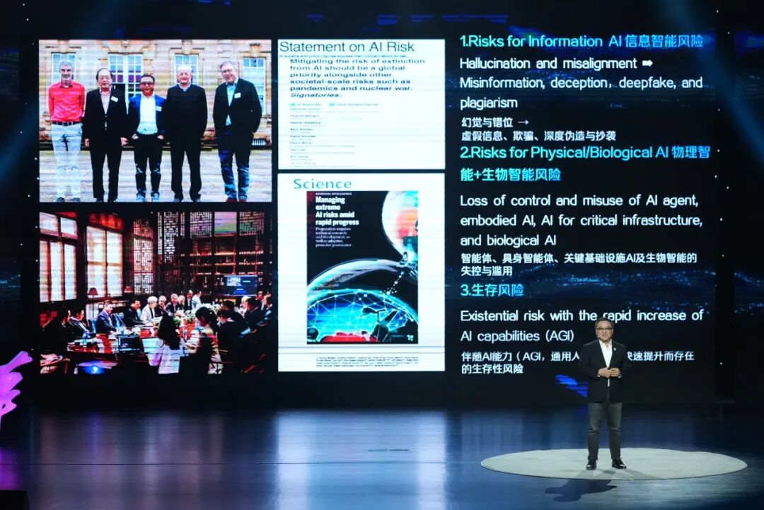 张亚勤院士特别提醒AI带来的潜在风险也在持续攀升,亟待全球协同应对。他指出“大模型能力在飞速发展,巨大的能力也带来潜在的风险”,尤其在信息、物理和生物智能三个层面,风险呈指数级增长。张亚勤院士主张“AI必须是善良的”,其发展方向应由人类价值观引导,通过优质数据、算法框架与大模型架构确保AI向善。他呼吁建立分级分类体系、场景约束与评估机制,并提出“将对大模型投资的10%以上用于AI风险研究”。他还强调,政府应在技术早期阶段就参与监管,“技术先行、事后监管”的思路不可取。针对生存性风险,他支持设立明确红线——如禁止AI自主复制或寻求权力,并推动国际协同治理。张亚勤院士坚信:“人类有两种智慧,一个是发明技术的智慧,一个是引导它走向正确道路的智慧。”唯有融合技术、政策与伦理,才能确保AI真正造福人类。